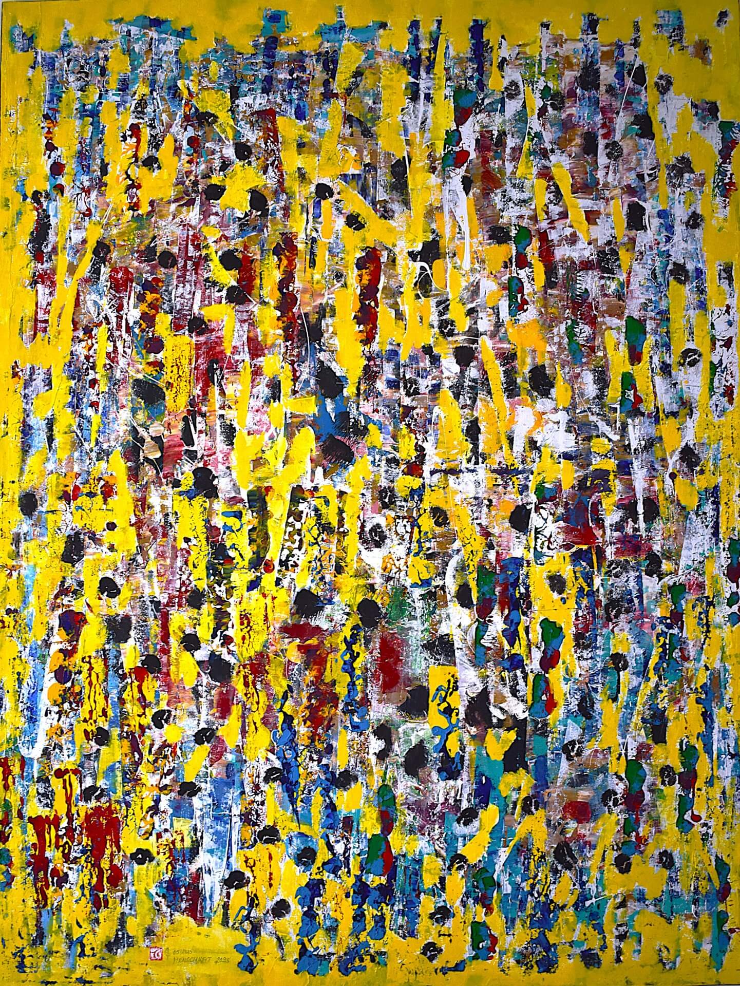 ABSICHTSLOS UND SPONTAN STELLEN FARBE UND GEBÄRDE IM GEMALTEN SAGE UND SPUR OHNE VORSTELLUNG VOR. LEER ZUGLEICH FORM IST IHR WELTEN WIE IM SPIEGEL WEDER DING NOCH IDEE. WIR ERLEBEN EIN UPDATE VON DER ANSCHAUUNG ZUR AUTOPOIESE*. DER WURF WIRD ZUM ENTWURF EINER WELT VOLLER POESIE.