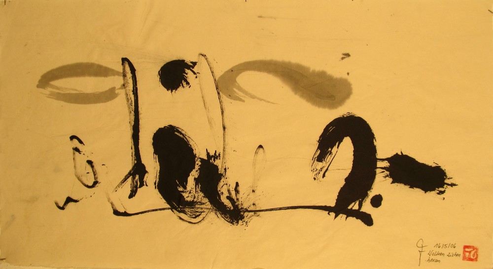 „WOLKEN ZIEHEN HERAN“ 2007 Ru(i)nen-Schrift: “WOLKEN ZIEHEN HERAN”, Chinatusche auf Reispapier, auf Reispapier geleimt, 48x27cm