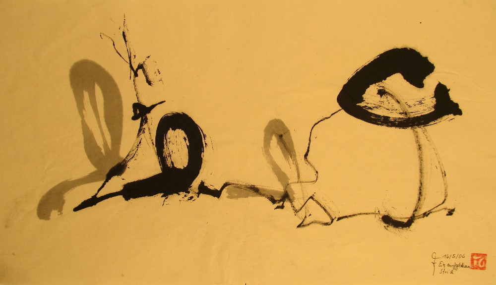 „EIN AUFGEBLASENER STRICH“ 2007 Ru(i)nen-Schrift: “EIN AUFGEBLASENER STRICH”, Chinatusche auf Reispapier, auf Reispapier geleimt, 48x27cm