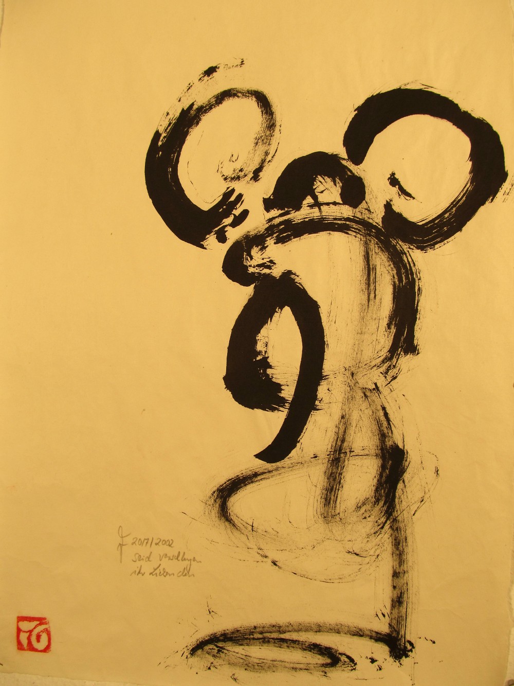 „SEID VERSCHLUNGEN IHR LIEBENDEN“ 2002 Ein Ductus erzählt: “SEID VERSCHLUNGEN IHR LIEBENDEN”, Chinatusche auf Reispapier, auf Reispapier geleimt, 34x48cm