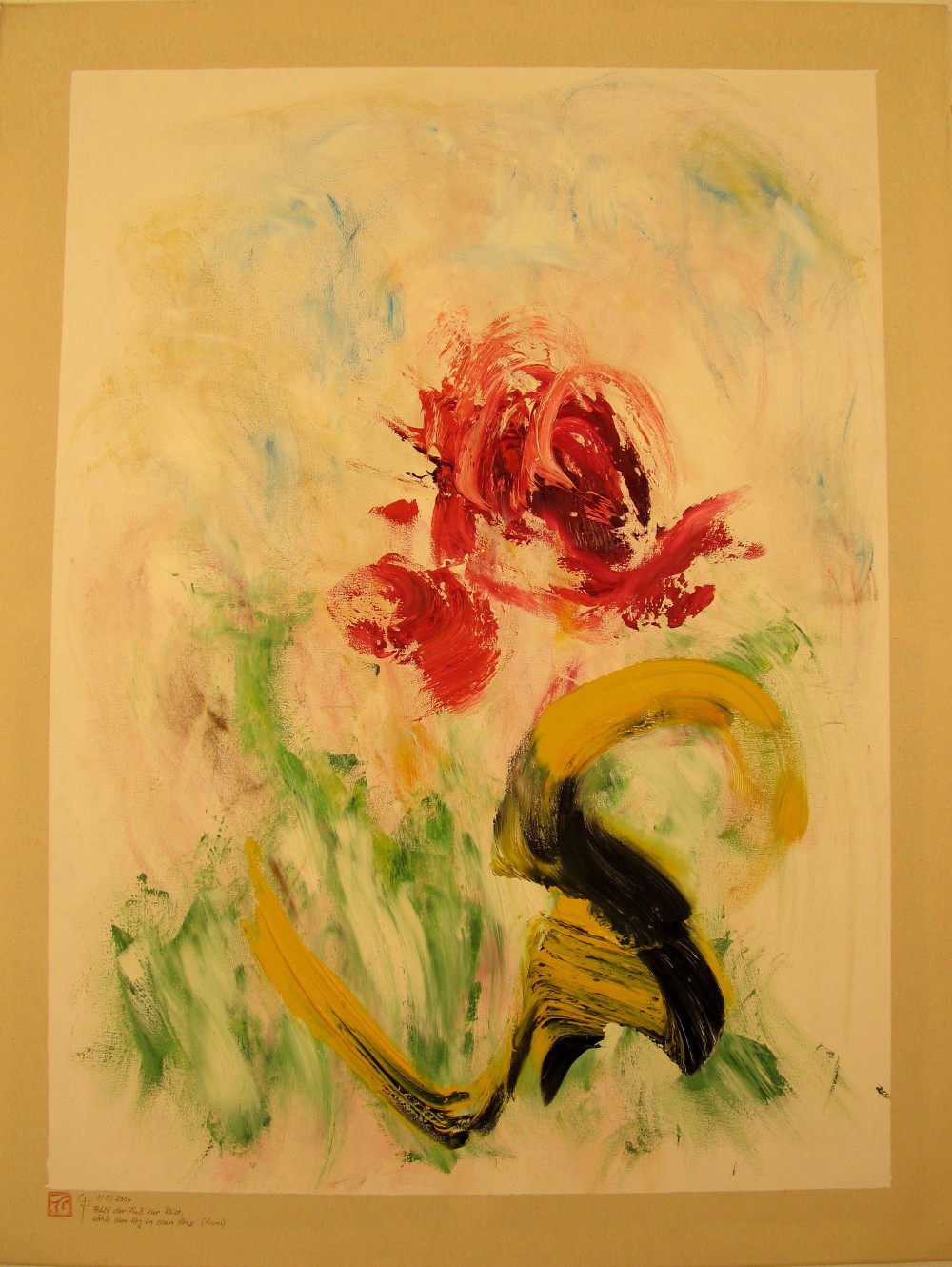 „FEHLT DER FUSS ZUR REISE, WÄHLE DEN WEG INS HERZ“ (Rumi) 2004 Poegrafie: “FEHLT DER FUSS ZUR REISE, WÄHLE DEN WEG INS HERZ”, Öl auf Nessel, 100x130cm