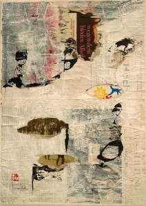 „AlkoholRad“ 2015 „AlkoholRad“, Kalligrafiecollage: Zeitungspapier, Acryllack, Chinatusche auf Nessel geleimt, 50x70cm