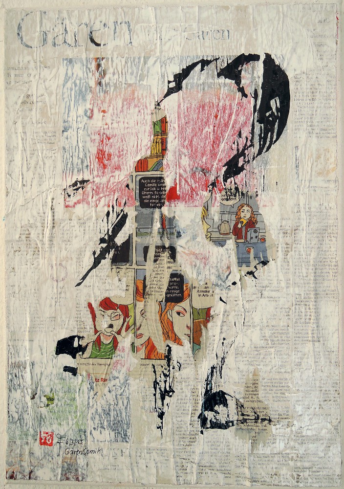 „GärenComik“ 2015 „GärenComik“, Kalligrafiecollage: Zeitungspapier, Acryllack, Chinatusche auf Nessel geleimt, 35x50cm