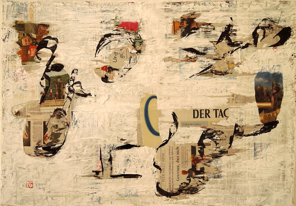 2015 „DerTag“, Kalligrafiecollage: Zeitungspapier, Acryllack, Chinatusche auf Nessel geleimt, 105x75cm