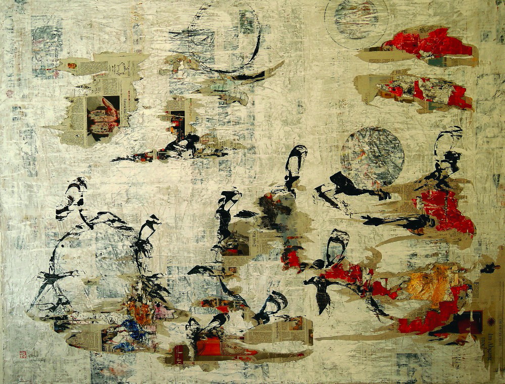 „KreisAbgang“ 2015 „KreisAbgang“, Kalligrafiecollage: Zeitungspapier, Acryllack, Chinatusche auf Nessel geleimt, 180x140cm