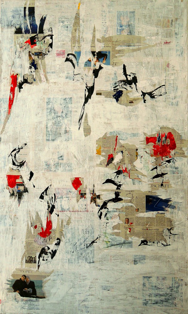 „PaarSchaft“ 2015 „PaarSchaft“, Kalligrafiecollage: Zeitungspapier, Acryllack, Chinatusche auf Nessel geleimt, 120x200cm