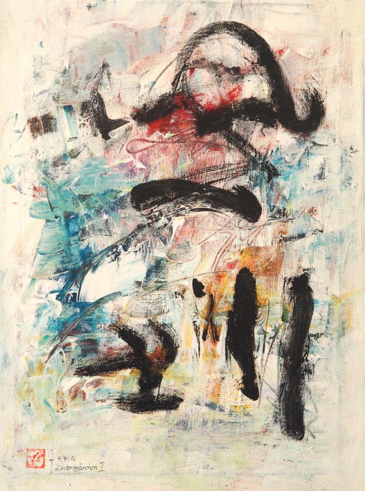 2016 „Wintermärchen I“, Acryl, Acryllack, Ölkreide, Grafit, Chinatusche auf Nessel, 70x50cm