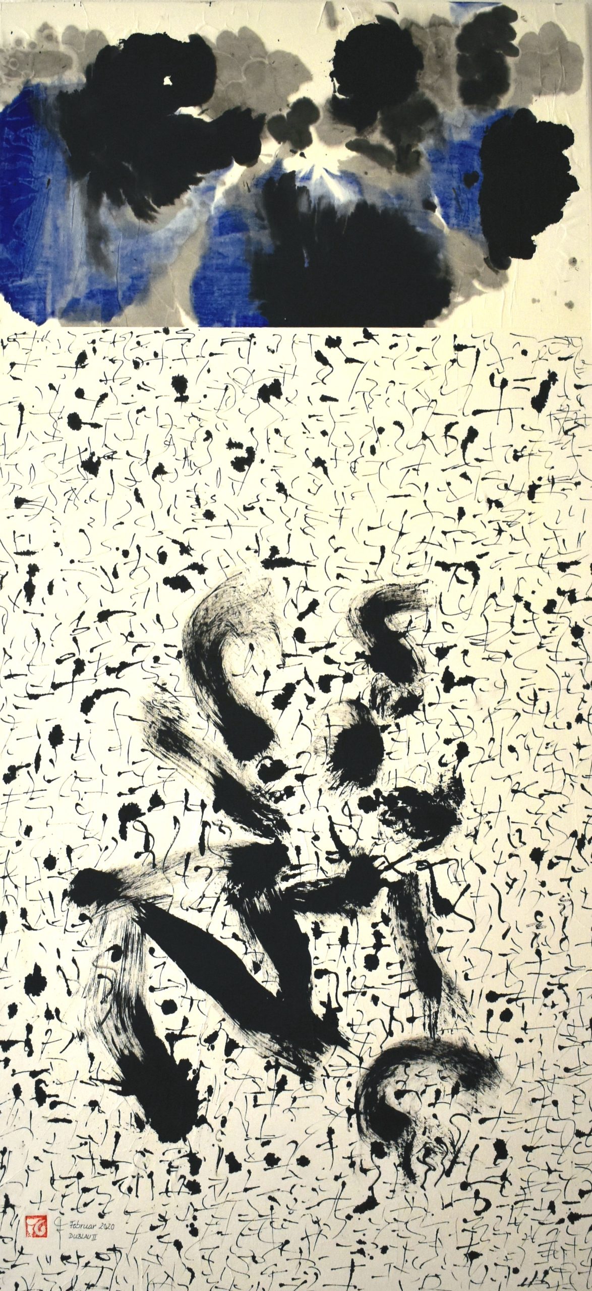 2020 „DUBLAU II“, Chinatusche, Tinte auf Reispapier, auf weiß grundierte Baumwolle geleimt, 70x150cm