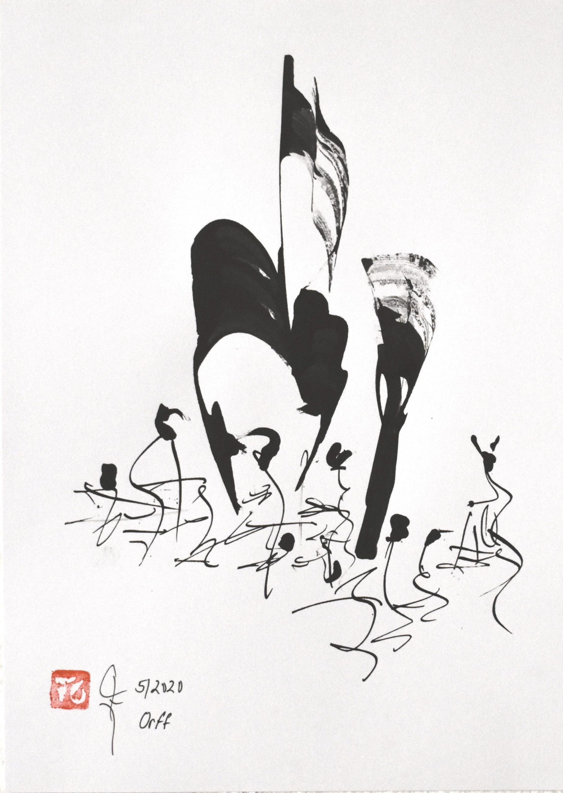 2020 „ORFF“, Chinatusche auf Fotokarton gespachtelt, geschrieben, DIN A4