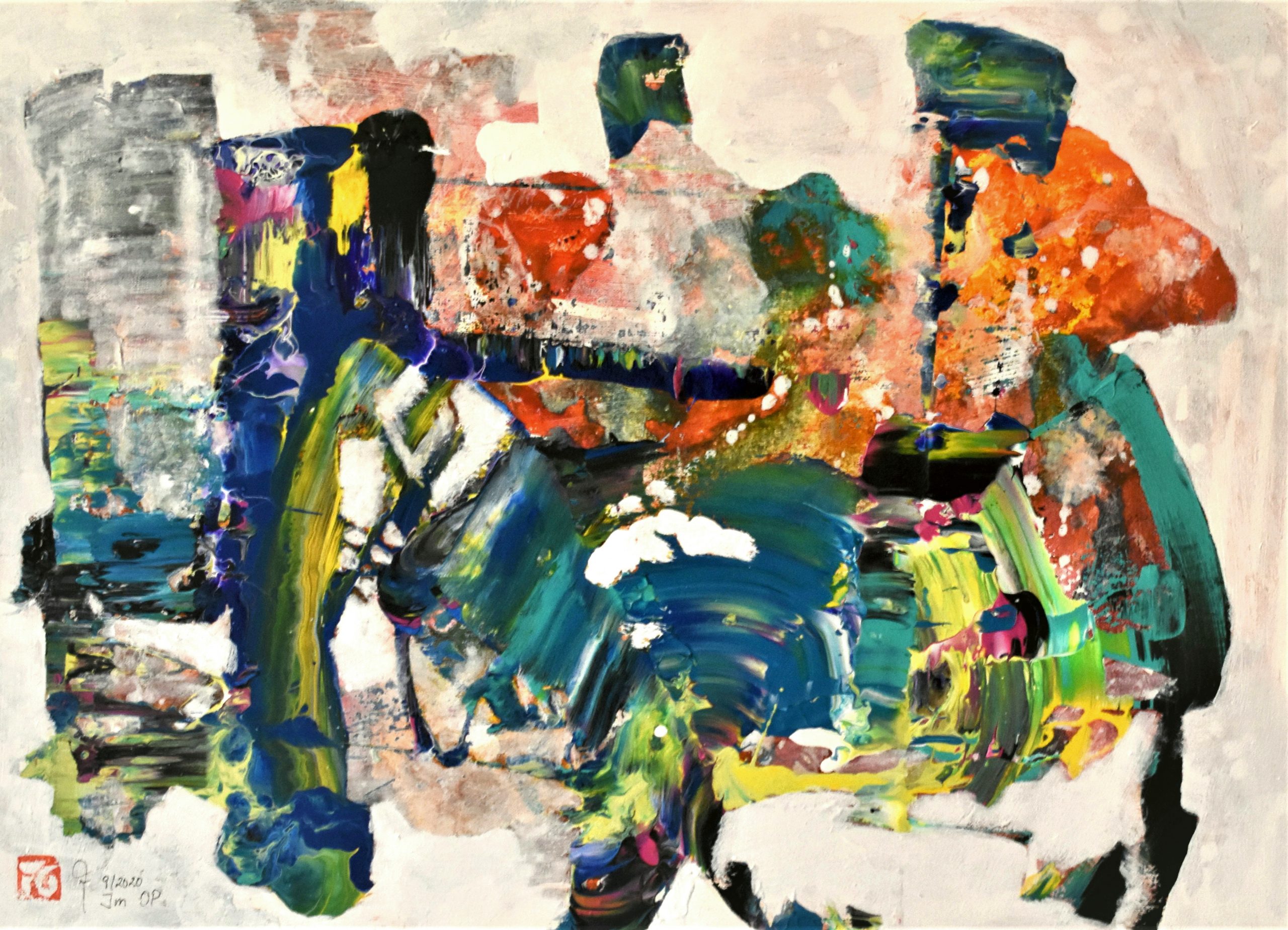 2020 „IM OP“, Acryl, Acryllack auf Baumwolle gerakelt, weiß übermalt, 70x50cm