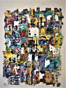 TREPPAUF TREPPAB 2021 „TREPPAUF TREPPAB“, Acryl, Acryllack auf Baumwolle gerakelt, weiß übermalt, 105x140cm