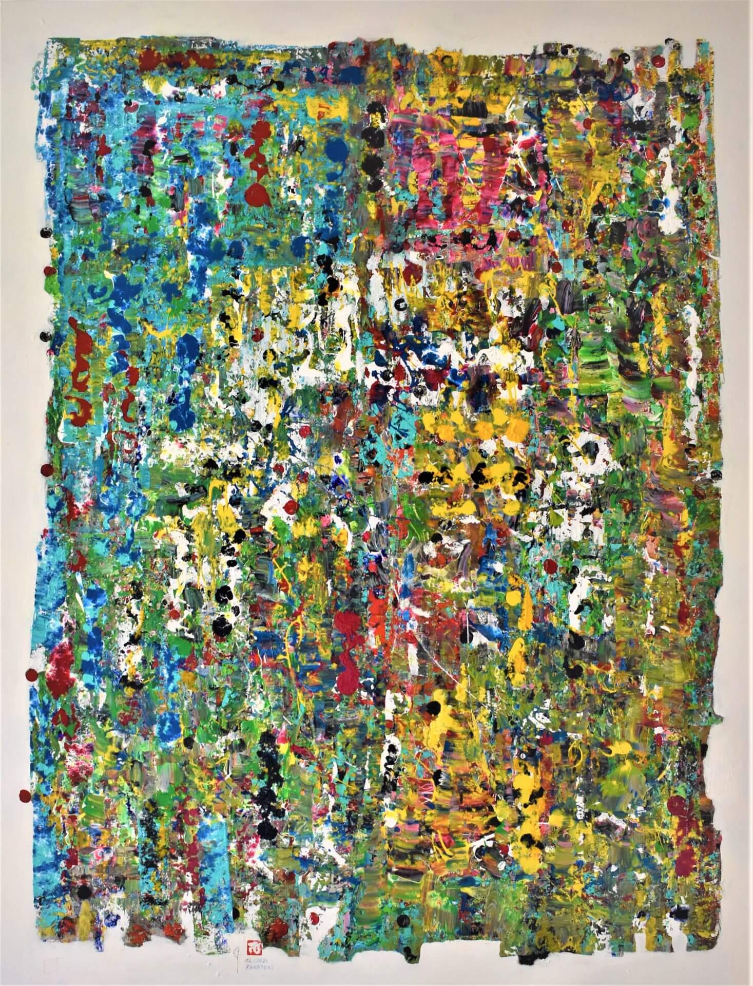 2021 „FARBTEXT“, Acryl, Acryllack auf Baumwolle gerakelt, weiß übermalt, 170x130cm