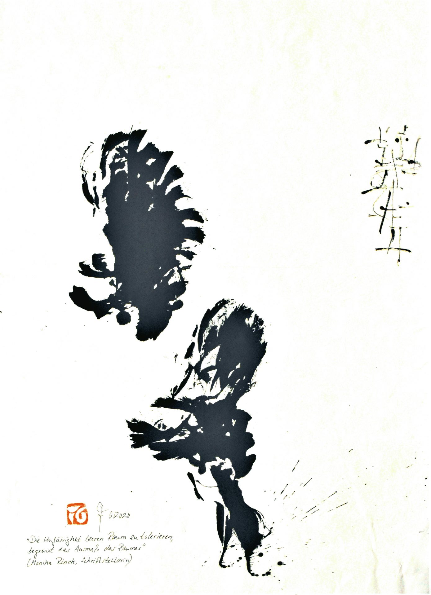 6/2021 MONIKA RINCK (Schriftstellerin): „Die Unfähigkeit leeren Raum zu tolerieren, begrenzt das Ausmaß des Raumes“, Chinatusche auf Reispapier, auf Reispapier geklebt, 50x70cm