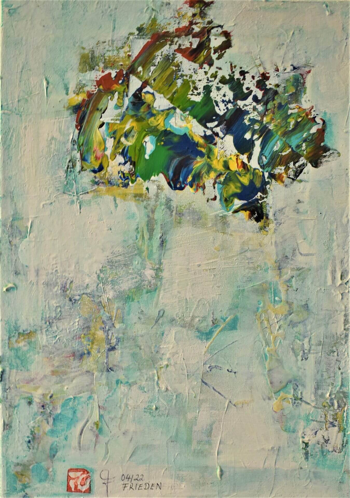 04/22 „FRIEDEN“, Acryl und Acryllack auf Baumwolle, weiß übermalt, 35x50cm