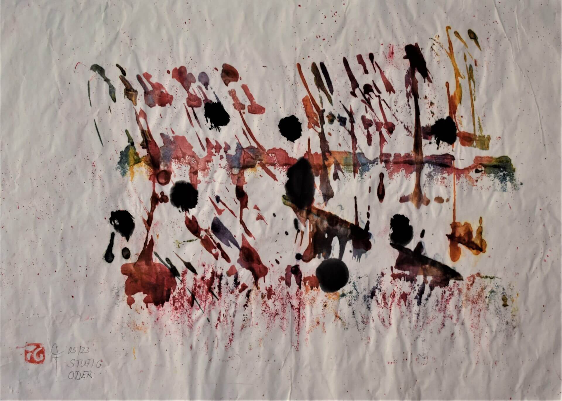 „STUFIG ODER“ 06/23 „STUFIG ODER“, Chinatusche und Batikfarben auf Reispapier, auf Reispapier geleimt, 68x48cm