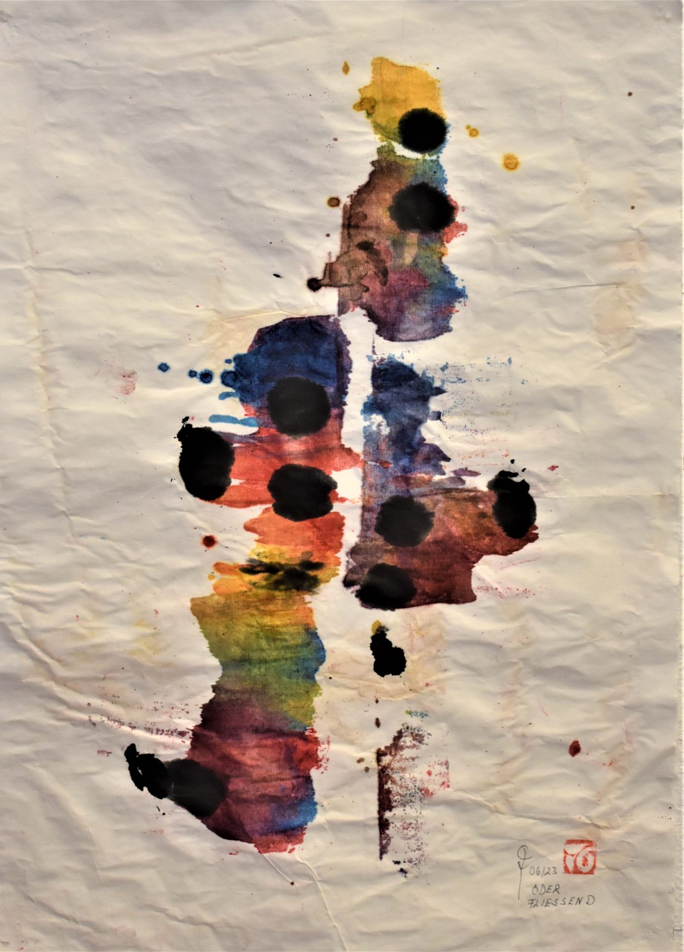06/23 „ODER FLIESSEND“, Chinatusche und Batikfarben auf Reispapier, auf Reispapier geleimt, 48x68cm