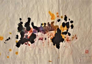 „VERSPIELT ODER“ 06/23 „VERSPIELT ODER“, Chinatusche und Batikfarben auf Reispapier, auf Reispapier geleimt, 68x48cm
