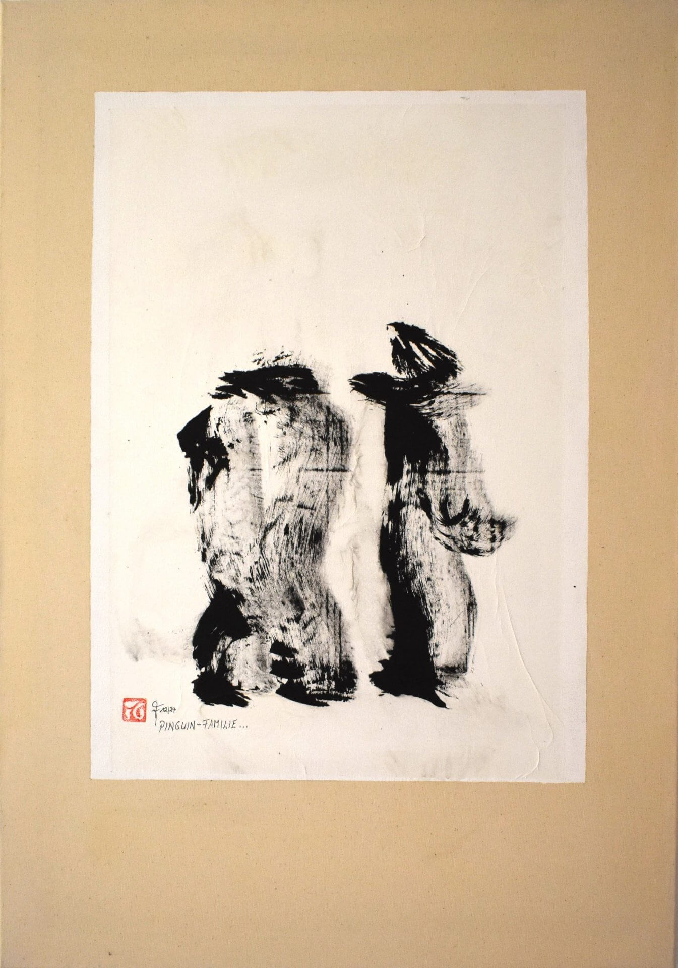 „PINGUIN-FAMILIE“ 12/24 „PINGUIN-FAMILIE“, Chinatusche auf Reispapier auf weiß grundierte Leinwand geleimt, mit Passepartout 70x100cm