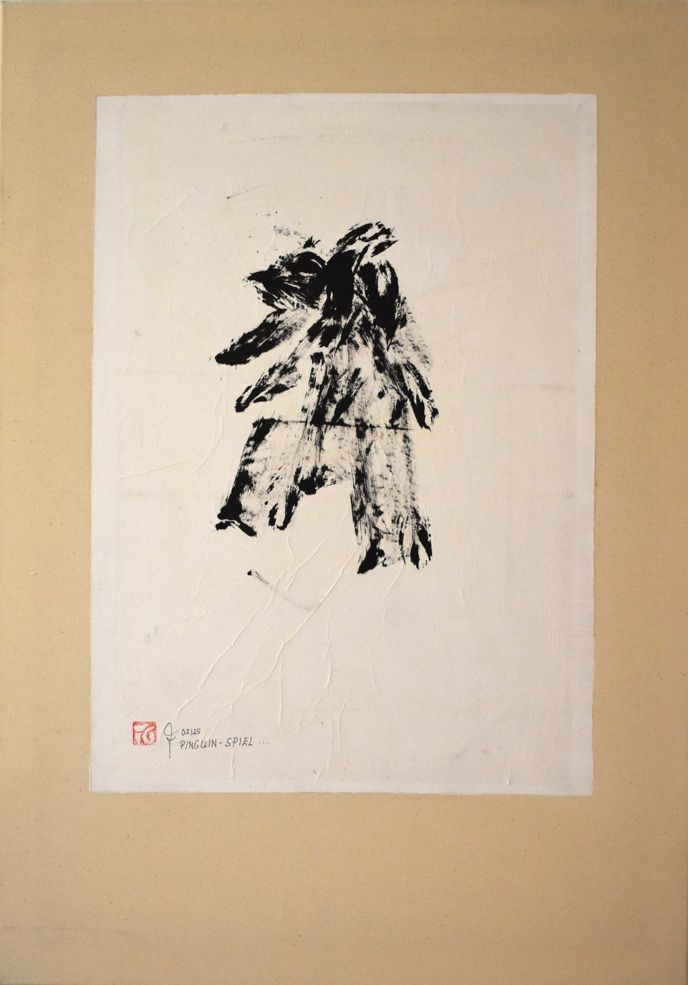 „PINGUIN-SPIEL“ 03/25 „PINGUIN-SPIEL“, Chinatusche auf Reispapier auf weiß grundierte Leinwand geleimt, mit Passepartout 70x100cm