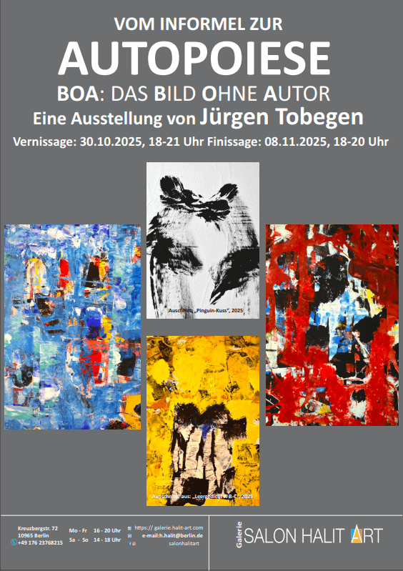Oktober/November 2025 „Vom Informel zur Autopoiese – BOA: DAS BILD OHNE AUTOR“, Galerie Salon Halit Art (Berlin Kreuzberg) – September 2025: 15. Kunstfestival „Art Kreuzberg“ in der StadtWERKSTATT (ehemals „Adlerhalle“) – September 2024: „WAHRSCHEINLICHKEITS-WOLKEN – Moderne Hieroglyphen“, Kapelle am Urban (Berlin-Kreuzberg) – November 2023: „ART BORN – MENSCH BIOSPHÄRE“, Perspektivwechsel Post Abstrakt. Galerie Salon Halit Art (Berlin Kreuzberg) – Oktober 2022: „KUNST DER SPUR“, Doppelausstellung in der Kapelle am Urban und im Galerie-Cafe „Dildile“ (Berlin-Kreuzberg) – September / Oktober 2021: „IM DIALOG MIT DEM ZUFALL“, Doppelausstellung in der Kapelle am Urban und im Galerie-Cafe „Dildile“ (Berlin-Kreuzberg) – Februar bis August 2020: „WELTMODERN“, Kirche auf dem Tempelhofer Feld – September 2019: „von SELBST“, Doppelausstellung in der „Kapelle am Urban“ und im Galerie-Cafe „Dildile“ (Berlin-Kreuzberg). – September 2018: „TRANSIT – Ein neues Menschenbild“, Galerie Salon Halit Art (Berlin-Kreuzberg) – Januar 2018: „BODYTEXT“, Doppelausstellung in der „Kapelle am Urban“ und im Galerie-Cafe „Dildile“ (Berlin-Kreuzberg). – Februar 2016: „DAS SCHÖNE KRITZEL“, GM 26, Gutsmuthstraße (Berlin-Steglitz). – Dauerausstellungen: „WILLKOMMEN IN DER WELTMODERNE“, Praxis: „Kiezhebammen Steglitz“, Grunewaldstraße – „MENSCHLICH ALLZUMENSCHLICH (MAM)“ und „TOBENDE KINDER“, Physiotherapie- & Osteopathiepraxis: „Körperkollektiv“, Kreuzberg